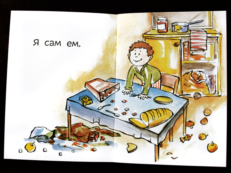 Книги Татьяны Русситы абсолютно ориентированы на малыша, примеряющего на себя роль именно читателя, а не ученика. На одном развороте ‒ одна картинка и одно предложение из трех слов. В каждом слове не больше четырех букв. Это совсем не трудно прочесть. А главное, предложения существуют не сами по себе, в некоем дидактическом пространстве «ребенка вообще», они складываются в действительно интересную моему сыну историю. Многие книжки из этой серии оказались буквально про него самого. Сколько эмоций испытывал мой маленький читатель! Вот это мне кажется очень важным на начальном этапе освоения чтения ‒ чтобы текст был максимально привязан к реальной жизни. Тогда чтение становится для ребенка естественным и любимым занятием, как катание на велосипеде или приготовление с мамой салата.