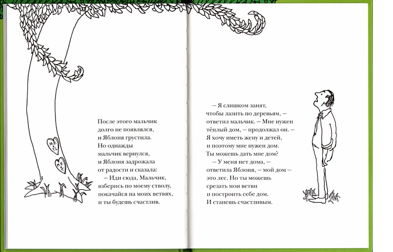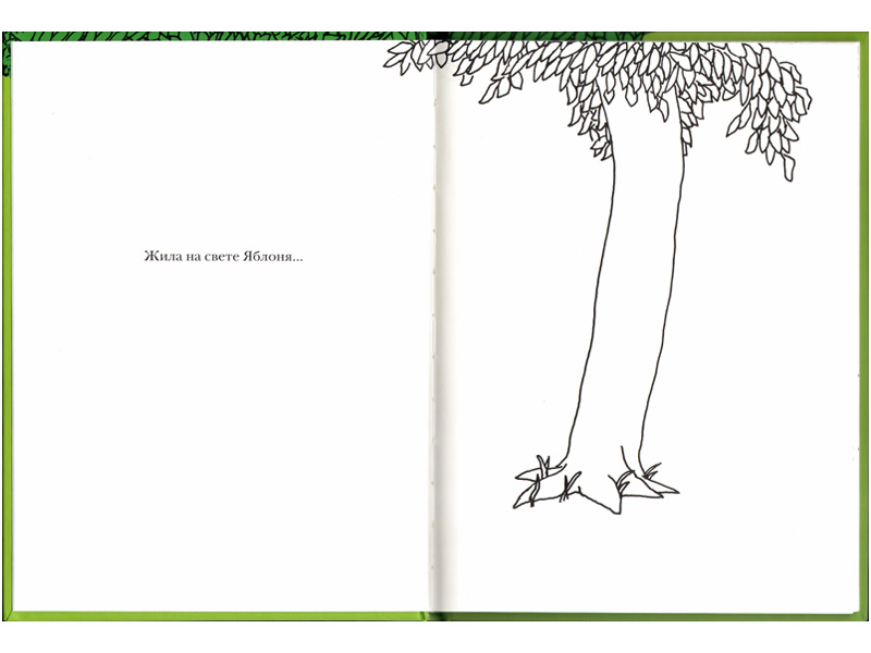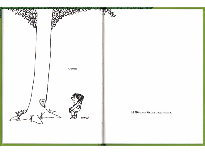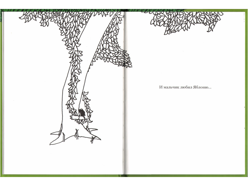 С образом Яблони мы уже были знакомы по сказке «Гуси-лебеди», где Яблоня прячет детей в своих веточках от Гусей-лебедей и просит отведать ее яблок. В книге Шела Сильверстайна Яблоня не ставит герою условия, а просто безоговорочно любит мальчика, потому что она большая, а он маленький, и потому что ей есть что ему дать. Даже когда он вырастает, для нее, большого дерева, он малыш.