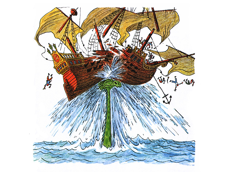 Однако Сайрус оказался нетипичным морским змеем: он плавал по морям, никого не ел и… сох от скуки. Тут акула стала подначивать его потопить какой-нибудь корабль, чтобы развлечься. И Сайрус даже всерьез об этом задумался, пока не услышал, как в порту один старикашка пророчит кораблю, собравшемуся в долгое плавание, скорую гибель.