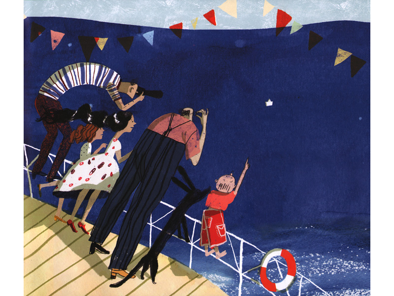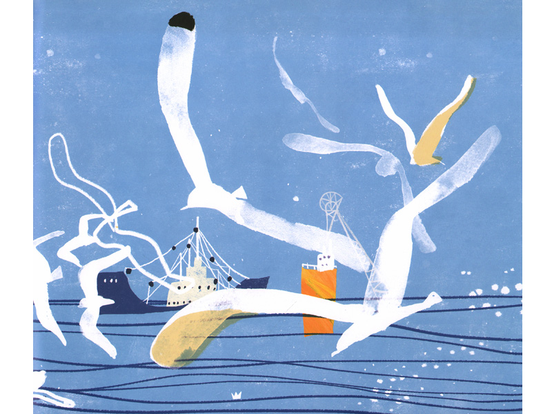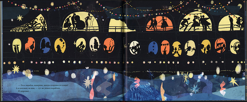 Мы перелистывали страницу за страницей и искали кораблик на каждом развороте: вот он пытается догнать катер, вот ему машут люди, проплывающие мимо на речном трамвайчике, а вот над ним парят чайки. Здесь он качается на черных штормовых волнах, а вот… он тонет.