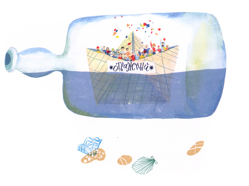 Иллюстрации Виктории Семыкиной – многослойные, яркие и выразительные. Картинки органично дополняют повествование, но вполне могут существовать отдельно, по ним можно придумывать истории о морских приключениях. Илюша как раз обожает фантазировать. Он рассказывает мне, откуда приплыл водолаз (оказывается, из далекой волшебной страны), что рыба могла бы оказаться золотой рыбкой и исполнить любое желание кораблика, а военный корабль выглядит очень страшно, наверно на нем никто не плавает, ведь люди боятся его. Большой простор для фантазии дает иллюстрация, где пассажирский лайнер изображен в разрезе и мы можем заглянуть в каюты и увидеть, что там происходит. Почему-то Илюшу больше всего забавляет окошко, где торчат чьи-то ноги. А меня привлекает веселье, царящее на верхней палубе корабля: танцы, музыка, смех.