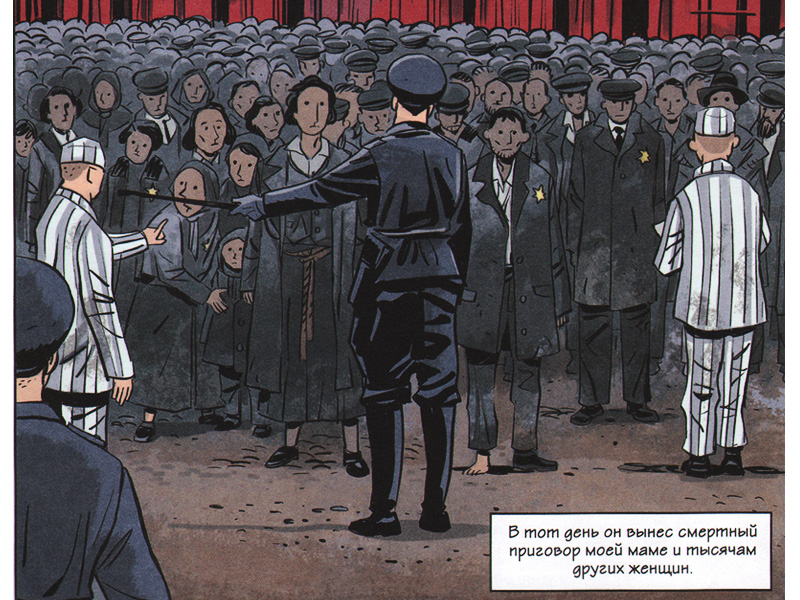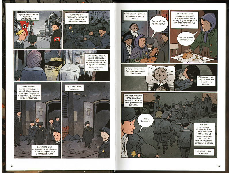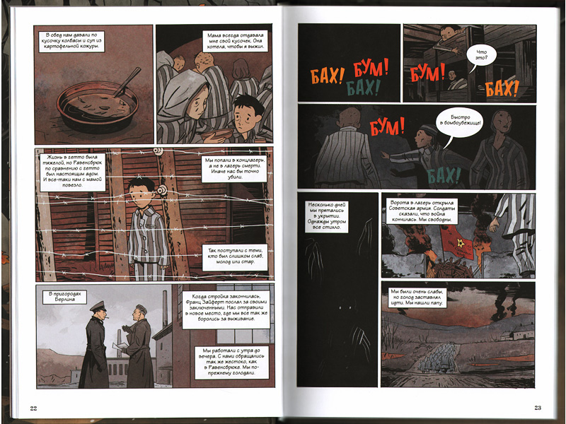 А здесь истории самые разные. Их рассказывают выросшие дети, которым удалось остаться в живых в этой мясорубке, потому что их спас шведский Красный Крест. Но почти у всех на их глазах погибали родные и друзья. Жизнь детей была невероятно тяжелой. Например, Сусанна трудилась на какой-то немецкой ферме, а Тобиас – на стройке. Они и остальные дети работали по 16 часов в сутки, хотя Тобиасу было около семи лет. Их морили голодом, били, унижали. И все это рассказано так, как будто слышны голоса этих людей. Некоторые иллюстрации в этом графическом романе по-настоящему шокируют. И я бы даже убрала их: мне кажется, они могут напугать нежных ребят, особенно, если они еще ничего не знают об этом, и, может быть, они не станут дочитывать книгу, а она хорошая, правдивая, жизненная. На мой взгляд, лучше рассказывать о лагерных ужасах словами, а не картинками. Большинство моих знакомых воспринимают мир через рисунки, граффити, фото, кино, а не через слово. Изображение в них входит сразу, впечатывается. А слово просто царапает. И если написать, то не так страшно. Только дети с очень развитым воображением воспринимают текст как кино. Мне кажется, что все-таки не надо, чтобы мы знали все ужасы войны и лагеря так, как будто мы там были.