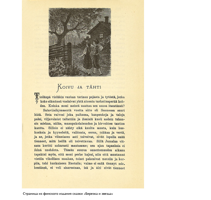 Одна из самых любимых в Финляндии сказок ‒ «Березка и звезда». Это трогательная история о судьбе двух детей, брата и сестры, которые в годы войны и голода были отправлены родителями из Финляндии в Швецию. Там в приемной семье их полюбили и воспитывали как собственных детей. Но когда самое страшное время миновало, дети узнали, что могут вернуться домой, и не могли больше думать ни о чем другом. Все, что они помнили об отчем доме, это звучание языка, на котором говорили родители, и высокую березку во дворе, сквозь листву которой светила вечерами звезда. Нарушив запрет своих попечителей, дети однажды ночью отправились в опасное путешествие. Через два года странствий они сумели отыскать отчий дом. Им помогло ожидание чуда, которое, как они были уверены, им пошлет Господь, если они будут верны своей мечте.