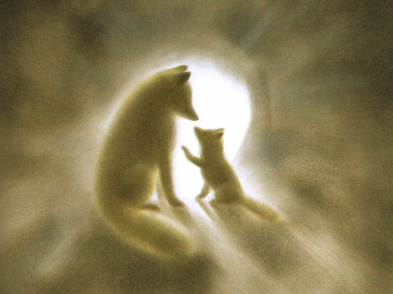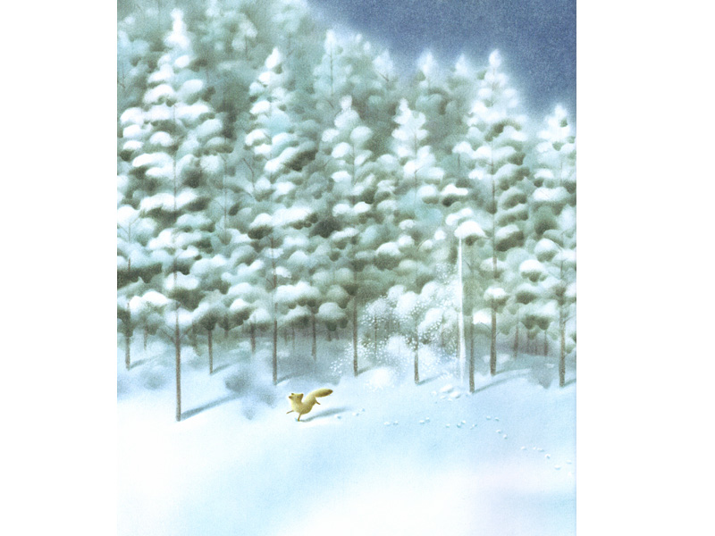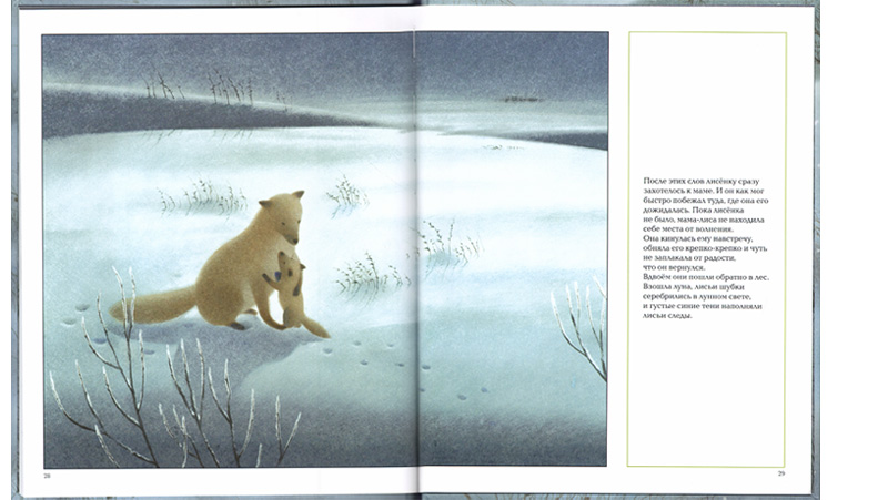 «Она кинулась ему навстречу, обняла его крепко-крепко и чуть не заплакала от радости, что он вернулся. Вдвоем они пошли обратно в лес. Взошла луна, лисьи шубки серебрились в лунном свете, и густые синие тени наполняли лисьи следы».
