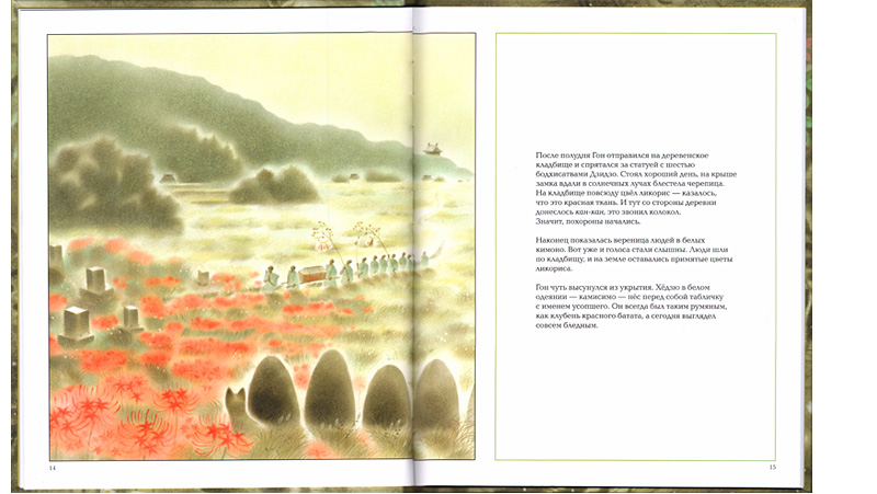 Заглянув во двор к знакомому человеку, лисенок Гон замечает, что одна из женщин чернит себе зубы, то есть, по японским обычаям, прихорашивается. Видимо, в этом доме праздник? Но тут же выясняется, что в доме Хёдзю, которому так симпатизирует Гон, похороны. В этом одновременно проявляется и японское, и андерсеновское: у печали нет табу, нет границы, проведенной ради того чтобы пощадить чьи-то чувства. И если правда этой сказки требует описания похорон, оно обязательно будет сделано во всех подробностях.