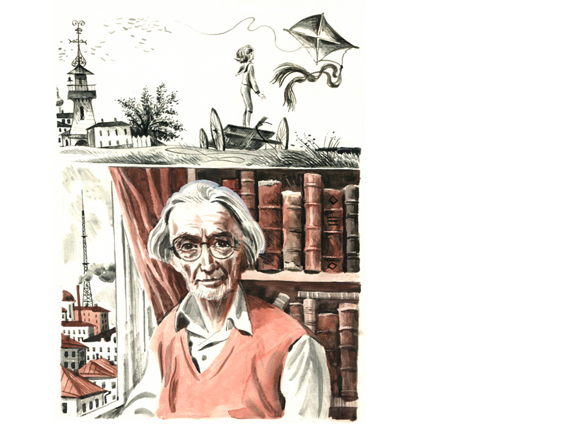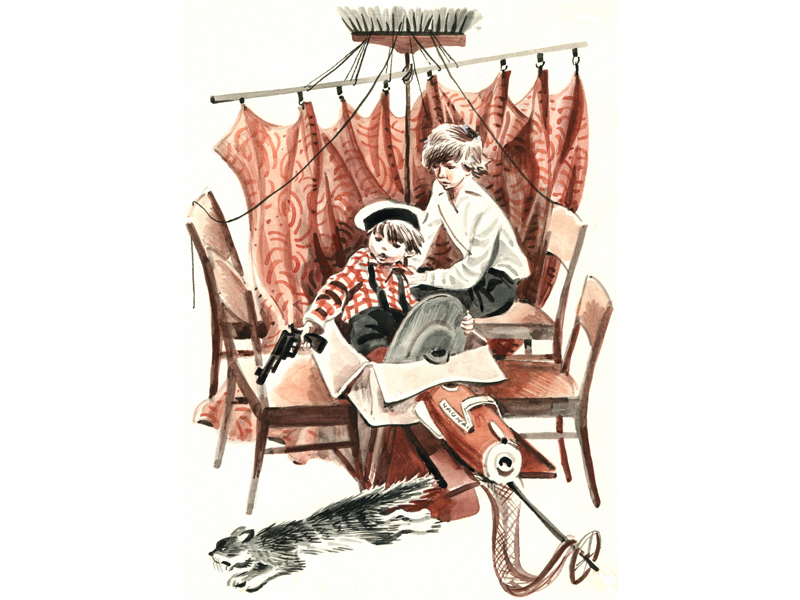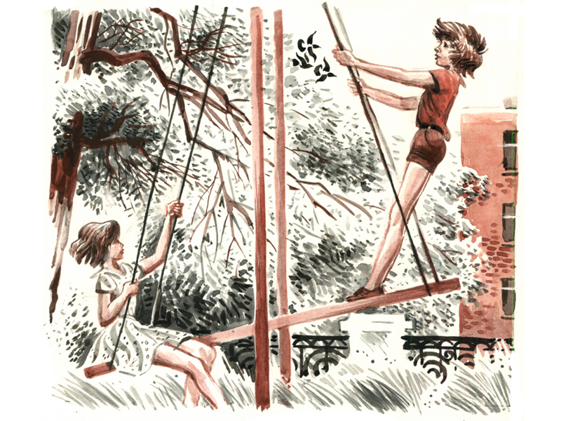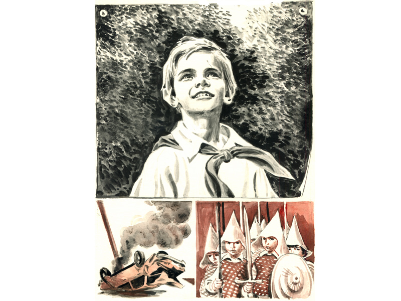 Книги Владислава Крапивина очень романтичные. И иллюстрации Евгения Медведева ‒ такие же романтичные. Растрёпанные подростки в чудной ретро-машине с клаксоном, Юрка и Иринка на качелях, машина для отвода молний… Глядя на иллюстрацию, как бы проживаешь происходящее вместе с героями. А, например, Юркиного деда я представляла себе именно таким, каким его изобразил художник: с приподнятыми уголками рта (наверное, раньше этот человек часто улыбался), но при этом – с грустными глазами. Видно, что этот человек одинок, и что от одиночества он устал. В верхней части этой цветной картинки есть чёрно-белый фрагмент: мальчик смотрит на улетающего вдаль воздушного змея. И непонятно – вспоминает ли Юркин дед своё детство, или думает о внуке?