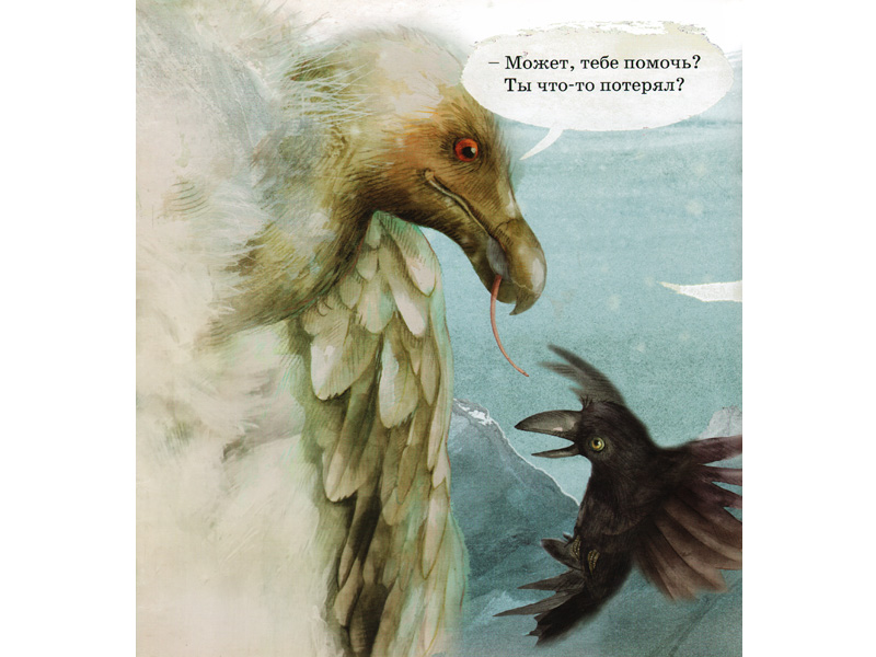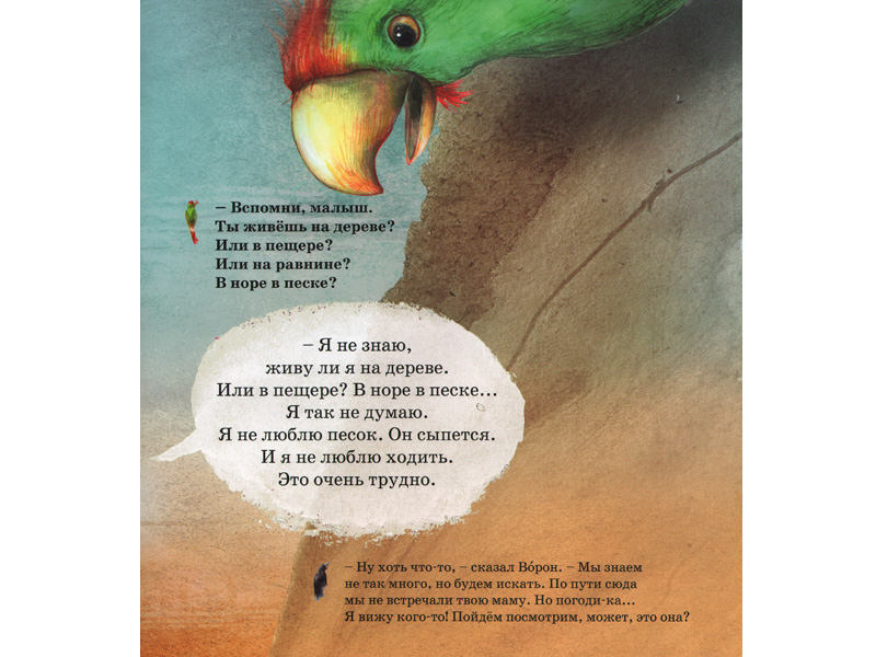 Таким образом, книгу можно читать на трех уровнях. Хорошо читающий ребенок старше 6 лет способен прочесть слова всех участников сюжета. Тот, кому читать пока еще трудно, может работать только со словами Попугая и его друзей – это несколько предложений на разворот. А если ребенок освоил лишь начальные навыки чтения, ему достаточно читать «облачка» со словами друзей Ворона и Попугая.