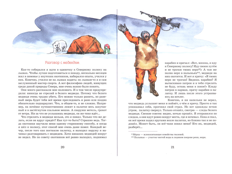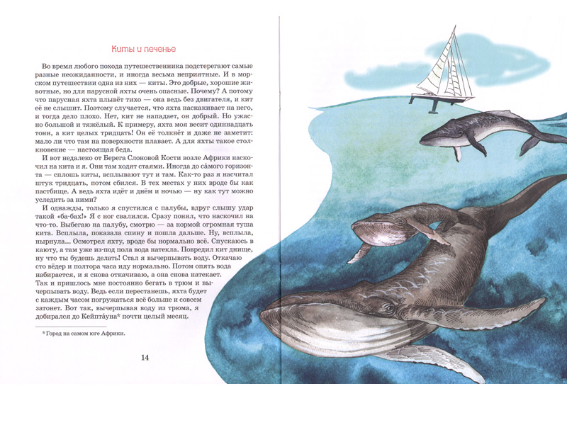 Конечно, дети и до этого знали, что путешественник должен быть смелым, знать карту, уметь плавать и ориентироваться по компасу. Но никто не знал, насколько важны опыт и знание подводных течений («Реки в океане»), не ожидал, как могут пригодиться любознательность и уважение к местным традициям («Разговор с медведем»), а уж о таких неожиданностях как цветная дорожка из упаковок печенья на поверхности воды («Киты и печенье») и вовсе никак не догадаешься («Это рыбки? Радуга?..»).