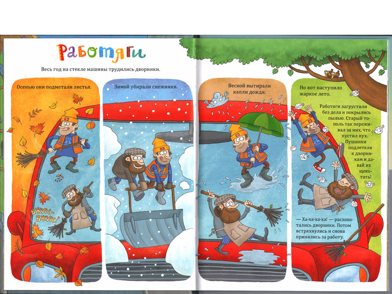 В книге «Ехали машинки» «читать» надо не только сами истории, но и иллюстрации. Это тот случай, когда рисунки работают наравне с текстом. Каждая история насыщается большим количеством деталей, выходит далеко за рамки текста. В сказке про дворники на окнах машины, которые трудятся без устали весь год, мы видим самых настоящих дворников, очень хара́ктерных и веселых, с метлами и лопатами. Станции метро с легкой руки художника приобретают названия «Семерокозлятово» и «Сероволковская», и мы видим козлят и волка из известной сказки. Некоторые страницы превращаются в дорожные лабиринты, по которым Илья очень любит «путешествовать». Магазин на одной из улиц называется «Семерочка», а булочная – «Конфетки-бараночки», баснописец Иван Андреевич Крылов декламирует с балкона «По улицам слона водили», пешеходный переход-зебра предстает в образе большого добродушного тигра…, – На каждой странице нас ждет множество забавных образов и аллюзий.