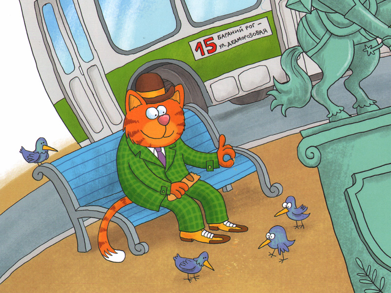 – Мама, смотри, кот Батон кормит птичек! А вот он в грузовике, везет целый ящик помидоров, довольный! А какие у него смешные ботинки и шляпа!