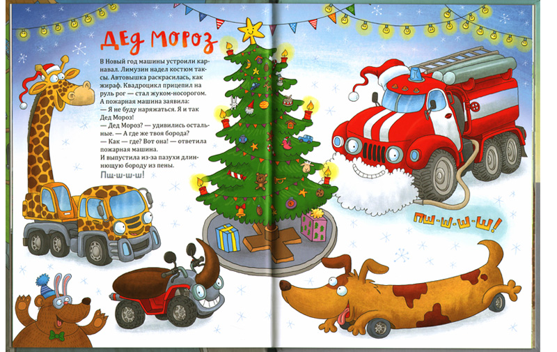 Илюше очень нравится история «Дед Мороз». В ней машины решили устроить карнавал, и каждая из них придумала себе костюм: лимузин превратился в таксу, автовышка – в жирафа, квадроцикл стал жуком-носорогом. Мы сразу начинаем придумывать, в кого бы нарядились машины из нашего многочисленного домашнего автопарка. Вспоминаем, что у нас есть машинки в виде крокодила и божьей коровки, им даже и костюмы не нужны.