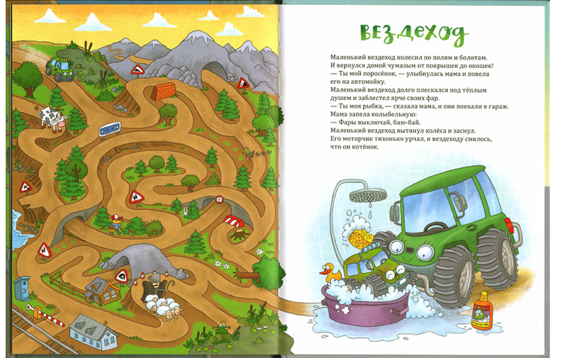 Читаем короткую историю под названием «Вездеход». Маленький вездеход весь день ездил по разным местам и вернулся домой «чумазым от покрышек до окошек». Большая мама-вездеход заботливо моет малыша, поет ему колыбельную «Фары выключай, баю-бай…» и укладывает спать. Вездеход засыпает, его моторчик урчит во сне, и ему снится, что он котенок… Теперь у Илюши есть колыбельная для его машинок.