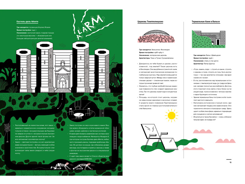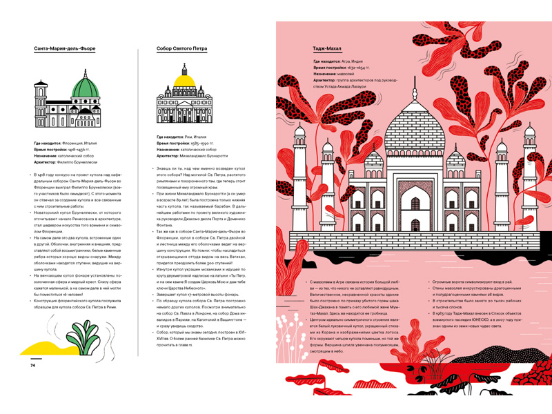 Архитектурные сооружения объединены в книге еще и по типологическим формам. Например, купол – крыша-полушар, покрывающая большое пространство без подпорок, чтобы вместить внутри много людей. Купола строились из самых разных материалов, могли быть закрытыми или с отверстием в центре (оно называется «окулюс»), через которое в здание проникал свет. И опять интересная подборка купольных построек: собор Святого Петра в Риме, Тадж-Махал в Агре или выставочный павильон «Купол Фуллера» в Монреале (другое название – «Биосфера») – купол-сетка из множества разносторонних треугольников.