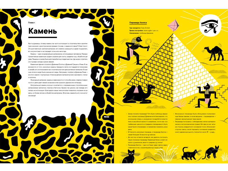В начале книги, в разделе про камень, автор просит читателя-ребенка задуматься, как и почему этот материал использовался человеком с древности. Каменные постройки возводили еще в Древнем Египте, Древней Греции и Риме. В зависимости от того, насколько камень твердый и насколько легко он поддается обработке (резьба, полировка), он служил либо для строительства, либо для украшения здания.