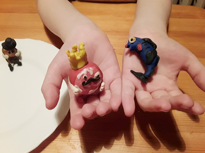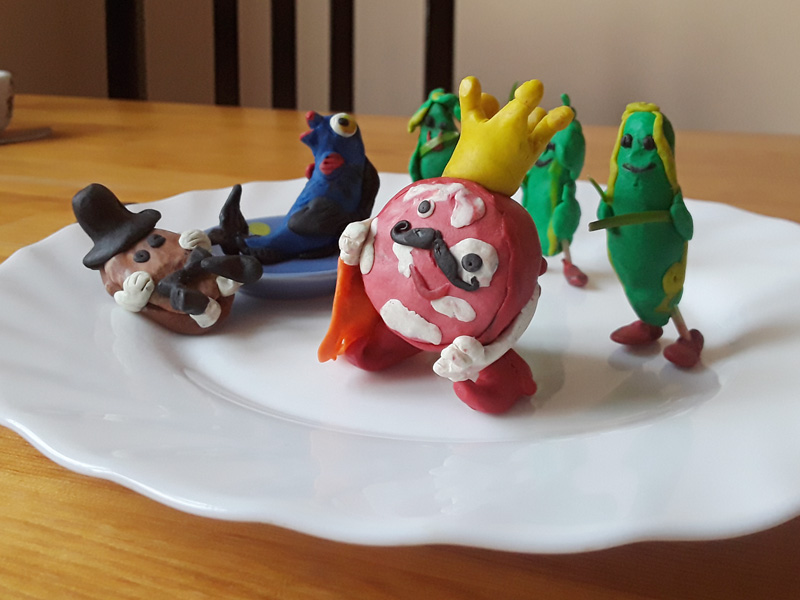 Начинаем лепить, и Сережа замечает, что у всех героев есть маленькие сапожки, тонкие ручки, а у паштета ‒ шляпа-цилиндр и белые чулочки. Мы еще раз разбираем игру слов: паштетот – этот, шуба селедки – селедка под шубой, стрелки зеленого лука – стрелы из лука.