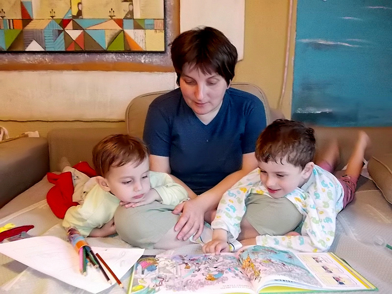 Еще один любимый английский стих Платона – про прыгающего Джона из сборника «Стихи и песни матушки Гусыни». «Маленький Джон запрыгнул в бидон, в бидоне темно — он прыгнул в окно, окно немыто – он прыгнул в корыто, в корыте пусто – он прыгнул в капусту, в капусте гадко – он прыгнул на грядку, на грядке тоскливо – он прыгнул на сливу, на сливе жутко – он прыгнул на будку, будку сожгли – он прыгнул в угли, уголь горячий – он прыгнул на клячу, кляча упала – читай все сначала!» И Лёня, и Тоша после нескольких прочтений запомнили текст наизусть и декламируют по очереди. Тоша очень любит быть первым: он начинает читать, а последнюю строфу, «Читай все сначала…», прямо-таки кричит Лёне в ухо. По идее, после этого Лёня должен начать чтение заново, но это не всегда происходит – у Лёни могут быть свои занятия. Жутко обиженный Платон тут же жалуется мне: «Ну я же сказал ему: читай все сначала! А он не слушается!» Приходится маме «читать все сначала», а закончить надо обязательно обращением к Тоше: «Читай все сначала!» Тоша с удовольствием это делает. Продолжаться так может очень долго…