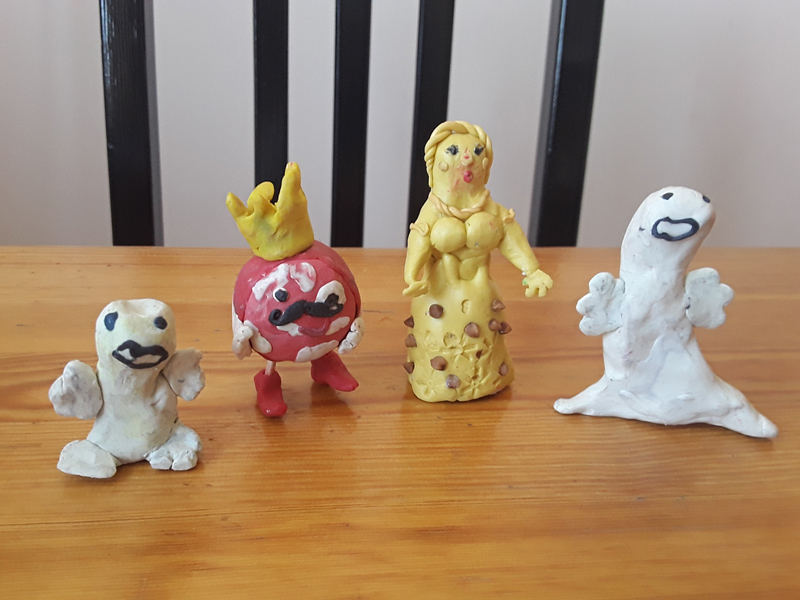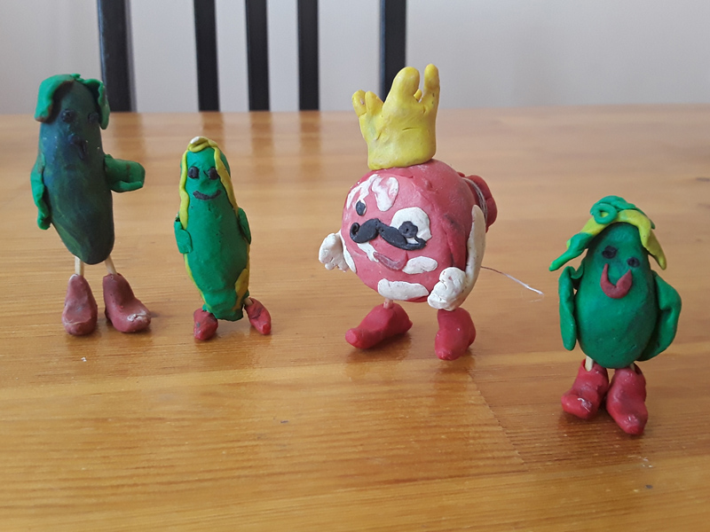 Майонезу противостоят полезные продукты. Фарш, лук и шпроты (Сережа не разбирается в видах рыб, но знает, что рыба полезна, хотя и не любит ее). Пока он согревает пластилин для новых персонажей, я доделываю его заготовки героев, и мы вспоминаем, какие же блюда можно приготовить из фарша. Тут Сережа удивляет меня своими кулинарными знаниями: котлеты, фрикадельки, макароны по-флотски.