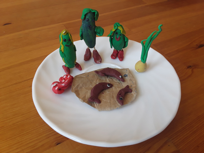 В нашем холодильнике в отдельном контейнере живут пластилиновые герои: Колбаска и Огурцы-молодцы. А недавно там поселилась красавица Каша, потому что мы продолжаем читать сказки Маши Рупасовой из книги о царе Колбаске. Ее «История майонезная» стала хорошим поводом для разговора о полезной и неполезной еде.