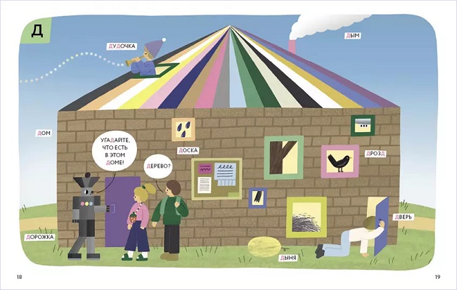 Эта книга организована по азбучному принципу, но едва ли можно назвать ее просто азбукой. Она предлагает отправиться в путешествие по Городу слов вместе с ребятами Алей и Яшей и роботом-экскурсоводом. Каждой букве посвящено несколько разворотов. На всех есть слова с той или иной буквой (причем не обязательно слово с нее начинается), которые сопровождаются картинками, и короткие фразы, в которых «изучаемая» буква выделена, а также самые разные задания. К примеру, на развороте с буквой «д» автор предлагает на крупном изображении дома отыскать другие предметы, в которых есть «д», на развороте с «а» – вспомнить, как называются морские обитатели.