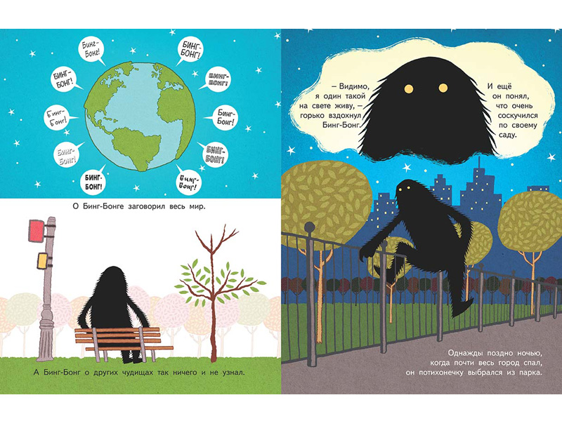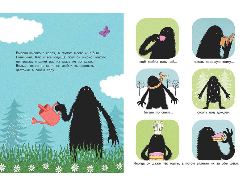 На обложке книги про Бинг-Бонга – кружочек с предполагаемым возрастом читателей: 3‒5 лет. Матвей, который выбрал эту книгу из десятка других, немного смутился: «А я не знал, что она для малышей…». В нем явно боролись два противоречивых чувства: желание заглянуть внутрь и боязнь показаться недостаточно взрослым. «Мне кажется, что эта книга не только для тех, кто ходит в садик, ‒ сказала я. – Давай-ка проверим, может ли она понравится нам с тобой».