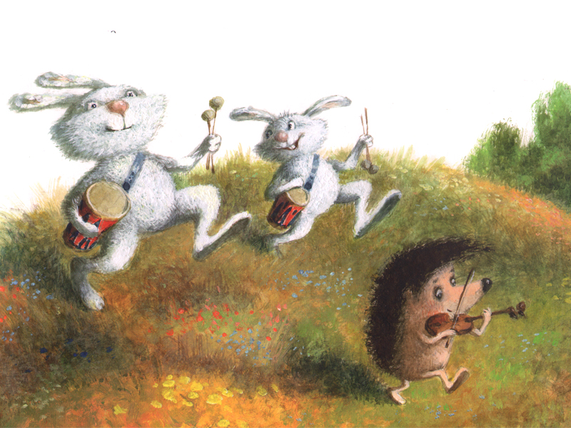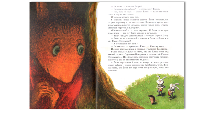 И что же из этого вышло? «Белка сидела в дупле и знала, что это Ежик стоит под сосной, играет “Грустного комарика” и называет ее Рыжим Солнышком… Но ей хотелось подольше послушать скрипку, и поэтому она не выглядывала из дупла. А Ежик играл целый день до вечера и, когда уставал, кивал головой зайцам – и они потихонечку барабанили, чтобы Белка знала, что Ежик все еще стоит внизу и ждет, когда она выглянет».