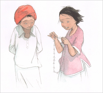 Камаль постучал в дверь дома, где жила девочка, и когда увидел ее, от волнения не смог произнести ни слова. «Он молча вручил девочке подарок – прекрасные бусы из арбузных семечек!»