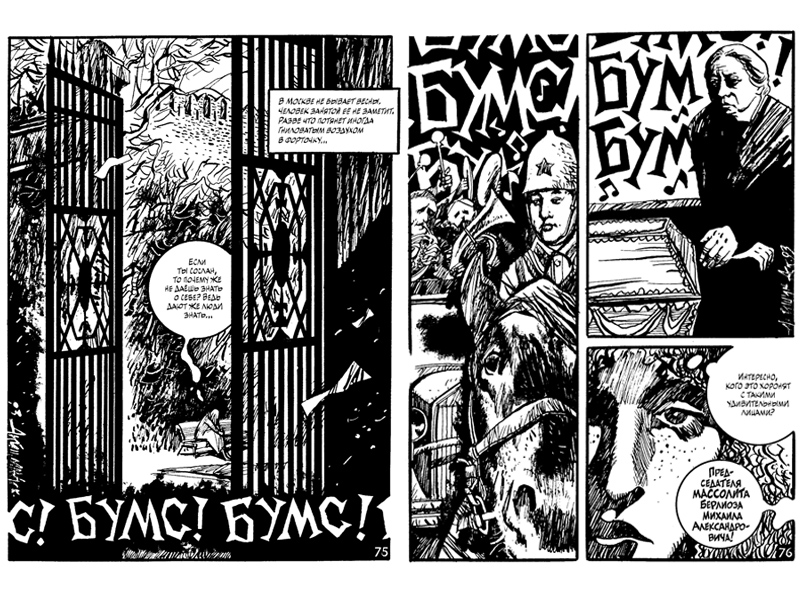 Мне кажется, что графическая версия ‒ это скорее история о визите Сатаны. С первых же страниц у читателя не возникает никаких сомнений о том, кто именно жарким летним вечером явился в Москву тридцатых годов прошлого века: на голове Воланда, удивительно похожего на графа Дракулу из старых фильмов, отчетливо видны рожки, и никакой симпатии к нему и его свите у авторов графического романа нет. Свита Воланда больше похожа на шайку щипачей, чем на благородных разбойников времен Робин Гуда.