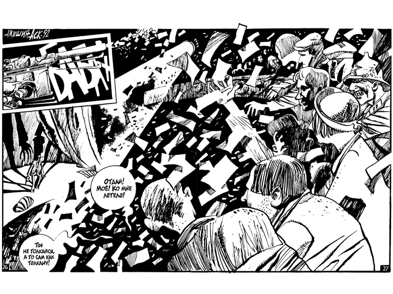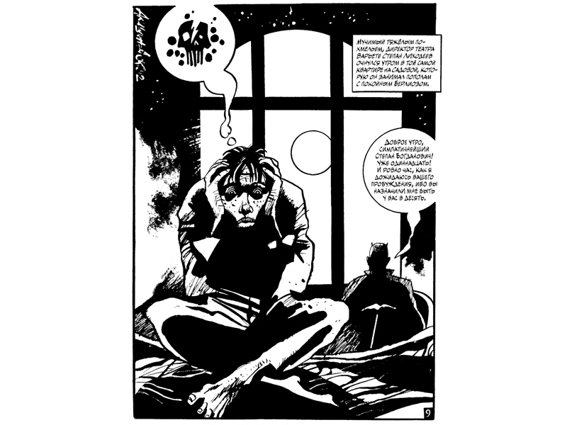 Но больше всего меня поразило то, как художник передает ритм, динамику «Мастера и Маргариты», в каждом рисунке вслед за Булгаковым повторяет: «За мной, мой читатель…» Страницы сценария движутся, как кадры черно-белого немого кино, где каждый рисунок предваряет последующие. Уже первый рисунок, где Иванушка с Берлиозом мирно беседуют под сенью лип, пересечен фигурой смерти с косой, намекая на следующие события, а вверху страницы вдалеке спускаются на землю летучие мыши. А дальше Берлиоз, устремляясь к телефону, перешагивает за рамку рисунка, как будто уходит со страниц романа, и читатель понимает, что живым он этого героя больше не увидит. Вот Степан Лиходеев, не в состоянии повернуть голову, чтобы не испытать головокружения, застыл на переднем плане, но взгляд невольно смещается вглубь рисунка, туда, где в мягком кресле утопает высокая худая фигура с рогами, ‒ и ты понимаешь, что ничего хорошего с Лиходеевым уже не произойдет. На другом рисунке Маргарита, сидя на лавочке в сквере, разговаривает с Азазелло, но общий план мгновенно сменяется крупным, как будто камера наезжает на лица героев, и движение продолжается: бьют часы, в нетерпении дрожит метла… На тех рисунках, где герои статичны, художник меняет перспективу, использует обрамление рисунка так, что глаза читателя невольно движутся по странице, наносит диагональные линии. Это бесконечное движение заканчивается только в эпилоге, когда герой, Мастер, уходит за линию горизонта, и читатель остается наедине с автором, который иронично улыбается с портрета, как будто ставит последнюю точку.