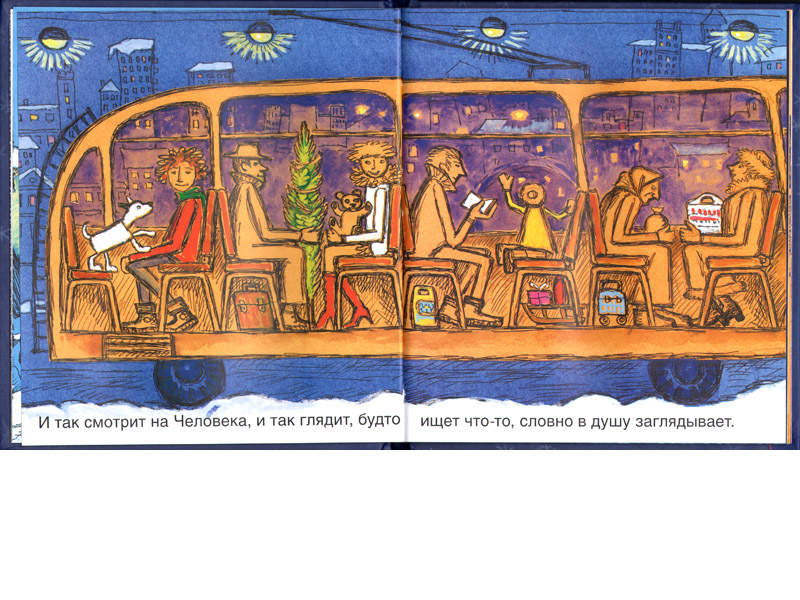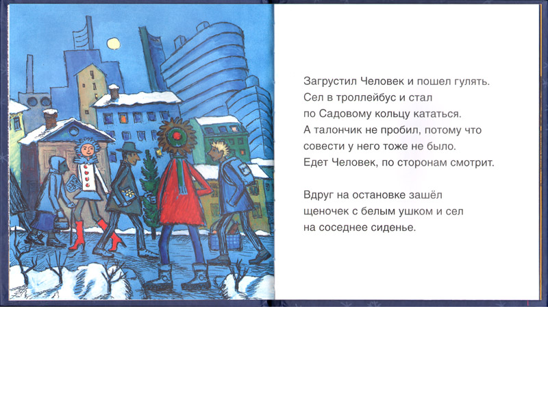 Это, конечно, детская книжка, но кое-что в ней написано для пап и мам, читающих ее вслух. Вот человек влез в троллейбус, а «талончик не пробил, потому что совести у него тоже не было». Вообще-то говоря, всяким разным взрослым неплохо бы ее прочесть, и может быть, прочти они такую книжку в детстве, легче было бы потом справляться с то и дело настигающим одиночеством. У человека-то ничего не было, а в книжке много что есть – и собака, потерянная и найденная, и человек, потерянный и найденный.