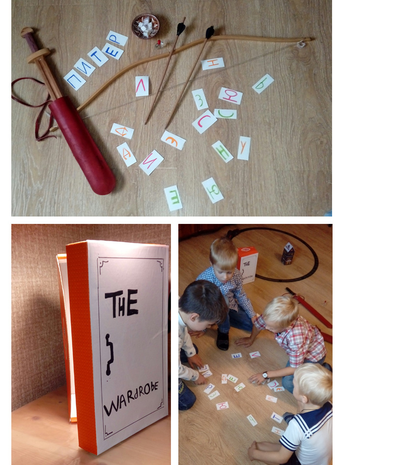 Интересно наблюдать, как игра рождается буквально на пустом месте. Английский жестяной домик и игрушечная железная дорога – отличное напоминание о начале повести, когда поезд увозил героев из горящего от фашистских бомб Лондона. Пусть в игре будет станция «England» (там должно быть какое-нибудь англоязычное здание). Игрушечные деревянные мечи почти сразу породили идею самого первого испытания, вводящего в приключение, – спрятать в комнате четыре предмета, которые могли принадлежать главным героям повести – Питеру, Сьюзен, Люси и Эдмунду. Пусть малыши попробуют догадаться, что это может быть, найти их и подписать, кому эта вещь принадлежит (для этого припасли меч, лук со стрелами, флакон с волшебным эликсиром (духами) и тарелку с настоящим рахат-лукумом). Аня заготовила карточки с именами, разрезав их на отдельные буквы и положив в бывшую обувную коробку, которая на время игры стала «платяным шкафом», «the wardrobe». Причем, когда раскрыли «шкаф», малыши еще должны были сами сообразить, что со всем этим делать. Сначала они решили, что надо подписывать найденные предметы, но далеко не все буквы для этого подошли. И тогда родилась догадка – вдруг это имена героев? Со складыванием имен из перемешанных букв справились быстро. Но перейти на следующую точку на карте и в следующую комнату для продолжения игры можно было, только если верно ответишь на вопросы по сюжету сказки (их было придумано десять). Разумеется, можно помогать и поддерживать друг друга. А вопросы были, например, такие: