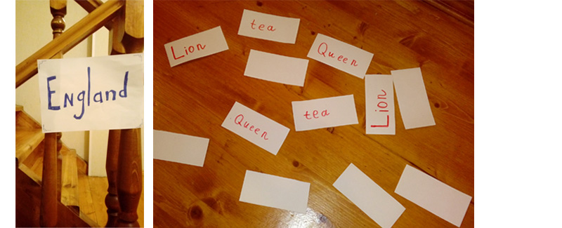В «Англии» («England») малышам было предложено сыграть в memory с английскими словами, встречающимися в сказке: lion, king, queen, castle, book, tea. Эта игра – одна из любимых, у нас множество наборов карточек для нее, и дети довольно рано и с большим удовольствием начинают в нее играть. Так что «английский» формат игры никого не смутил, а только раззадорил. Опять же, запомнили мимоходом несколько новых английских слов. И побежали дальше.