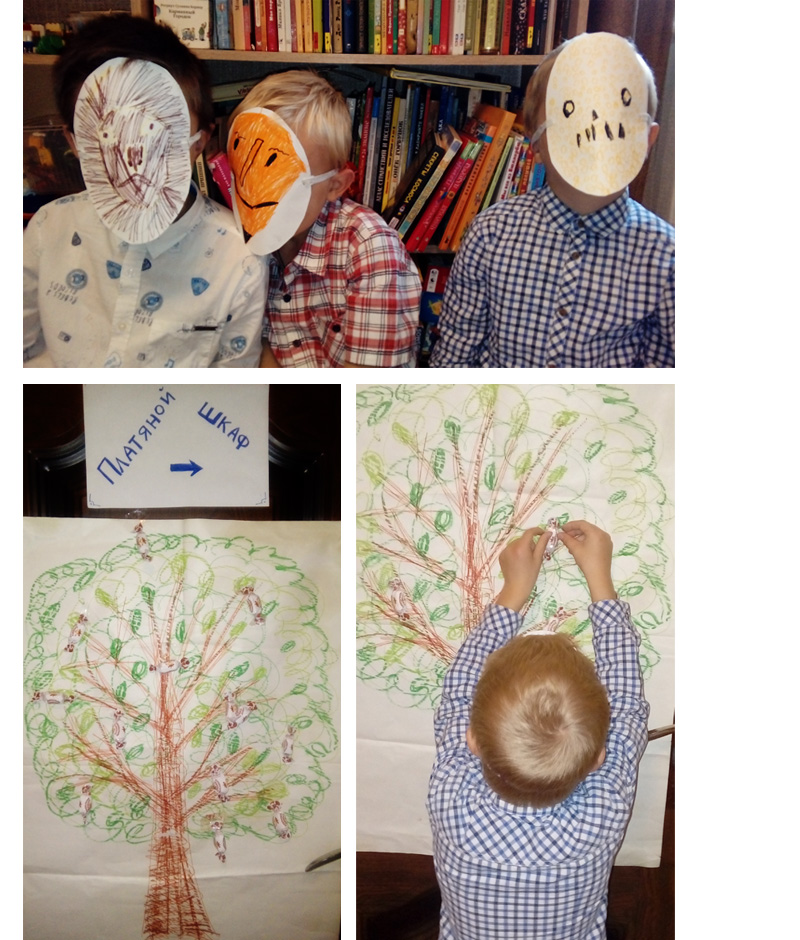 В «Лесу» (в детской) нужно было создать маску одного из животных-героев повести, предварительно вспомнив, какие именно представители животного мира обитали там. После недолгого совещания дети выбрали, конечно, Аслана, леопарда, его телохранителя, лису и птичку малиновку. И через несколько минут забавные маски были готовы. Правда, никто не сделал в них отверстия для глаз, но именно поэтому маски потом приходились еще в одном испытании – когда растили «Дерево тянучек» (оно попало в игру из «Племянника чародея», очень уж хотелось сыграть это веселое действо). К нарисованному цветными мелками дереву нужно было прикрепить с закрытыми глазами пригоршню тянучек, чтобы потом, в процессе игровой беготни, лакомиться между делом. Для этого задания отлично подошли наши маски, которые закрывали детские лица.