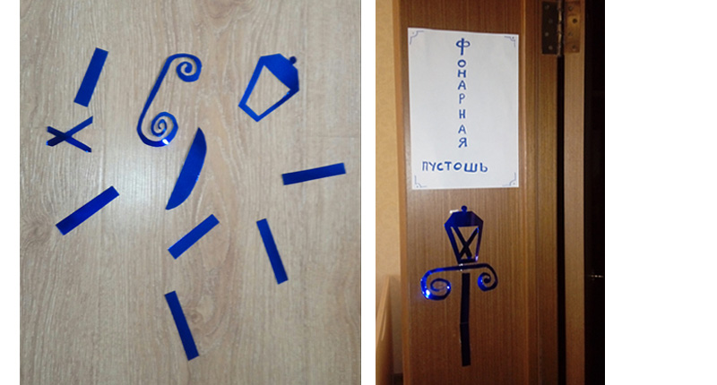 Еще одно пространство испытаний – «Фонарная пустошь» (комната старшей сестры). Здесь игроков ожидал конвертик с фрагментами чего-то блестящего, синего, что должно было стать неким целым. Фонарем, конечно! Оказалось, не так-то просто собрать его из отдельных кусочков, не имея перед глазами никакого образца. И снова, как и на всех других этапах игры, – вопросы на знание текста сказки. И бежим дальше.