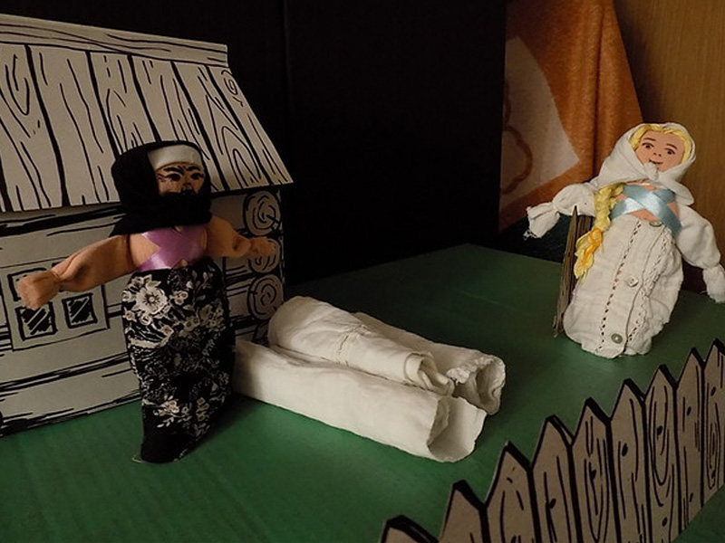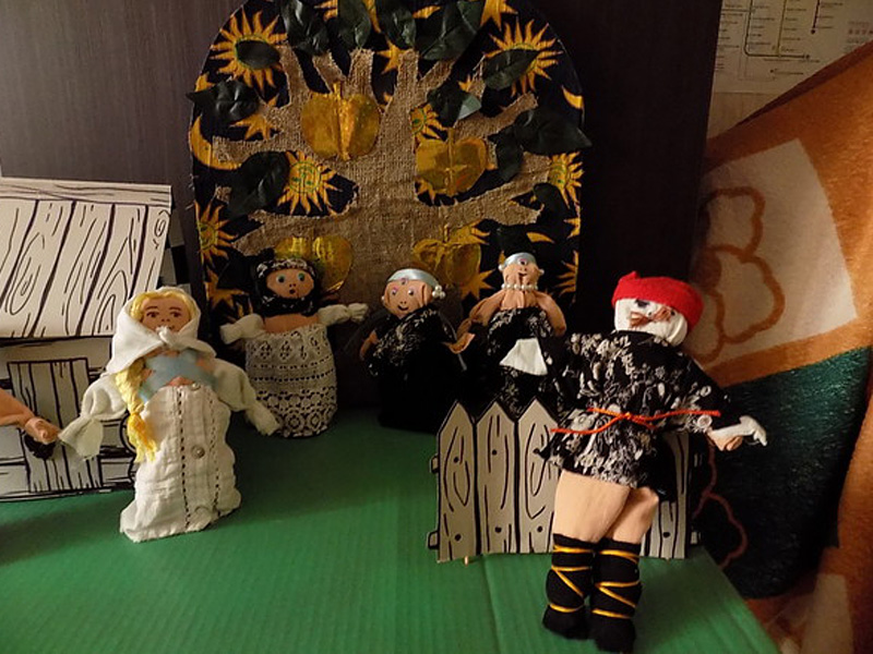 Чтобы передать эту атмосферу, я выбирала для создания декораций и кукол натуральные материалы (картон, мешковину, шерсть, глину, ситцевые ткани) и цвета, которыми в старину могли быть окрашены, с помощью растительных красителей, дающих приглушенные оттенки, домотканые ткани.