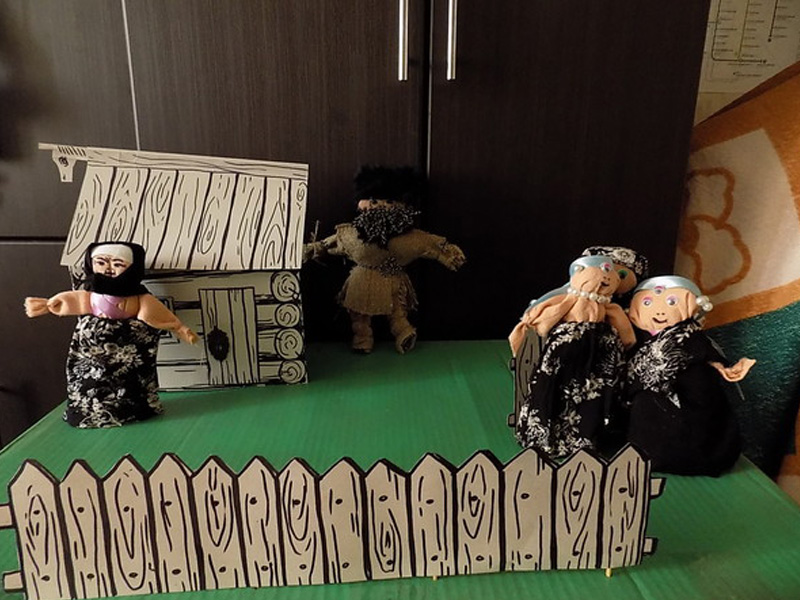 На таком же картоне нарисовала маркером и вырезала два дощатых забора. С обратной стороны приклеила к ним по две-три деревянных шпажки для шашлычков. Шпажки легко втыкаются в коробку-сцену, и их легко переносить с места на место по ходу спектакля, по-новому организуя пространство. Один заборчик у меня стоял на дальнем краю сцены. К нему я прислоняла кукол, не принимавших активного участия в какой-либо сцене. А второй забор передвигала. Если он стоял возле избы, то мы оказывались на деревенской улице, а если на переднем краю сцены, то зритель перемещался во двор. Если же я убирала избу, то получалось пастбище, луг.