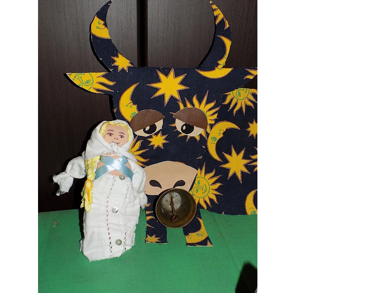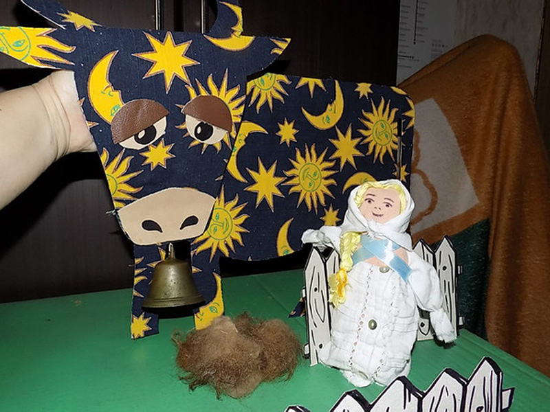 Из кусочков кожи вырезала и наклеила нос коровы и большие глаза с полуопущенными веками. А на шею Бурёнке надела самый настоящий бронзовый колокольчик! И хотя он на самом деле поддужный, но его звон придал спектаклю особую ноту.