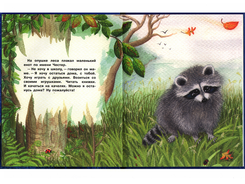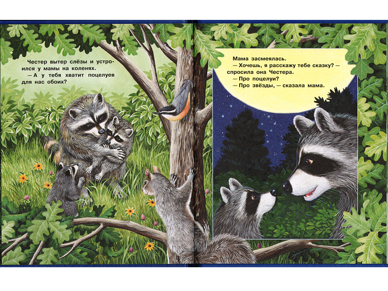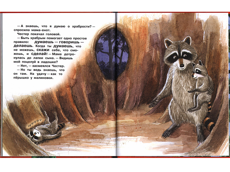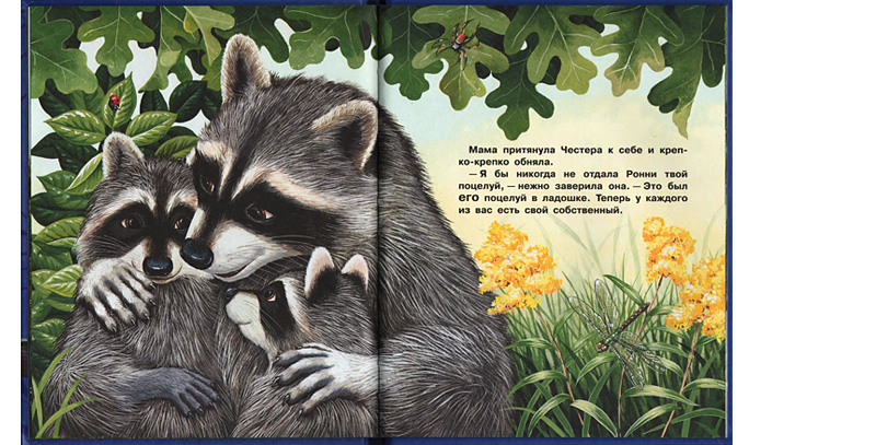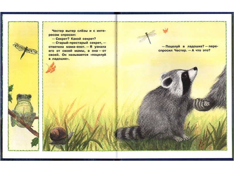 Вообще-то я считала эти книжки совсем «малышовыми» и уже малоинтересными для Феди. Или, как минимум, одноразовыми. Прочел, порадовался, отложил навсегда. Вряд ли их захочется перечитывать снова и снова, думала я. Сюжеты всех книг серии незамысловаты. Нет ни особой динамики, ни хитросплетений и интриг, ни загадок, до которых уже охоч стремительно растущий Федор. Сплошные переживания и крупные, на всю страницу, симпатичные картинки. Малыш-енот боится идти первый раз в школу, а мама его подбадривает поцелуем в ладошку, который светит ему, как маячок, напоминая о доме, где любят и ждут. В следующей книжке Честер остро и безутешно ревнует, не может разделить мамину любовь с младшим братом – мама снова подбадривает поцелуем. Причем их обоих. И поцелуй для каждого у мамы особенный. В третьей книге Честер боится выступать перед одноклассниками на уроке – и снова мамин поцелуй «про запас» и ее вдохновляющие слова помогают ему справиться. Ничего необычного, все вполне очевидно. Прописные истины в качественной полиграфии.