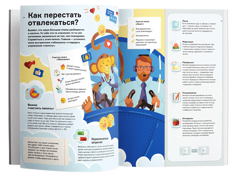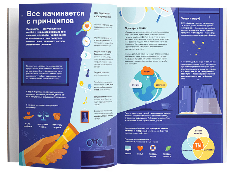 Каждый блок-тема поделен на главы, каждая глава ‒ это один яркий разворот с небольшими мотивирующими текстами и яркими картинками. Очень удобно читать, кстати. Например, блок «Кто я?». Главы – о принципах жизни, о счастье, о самооценке, о призвании и профессии, о привычках и силе воли. Множество интересных ремарок на полях, гиперссылки, как любят дети поколения «пальца на кнопке» (я искренне не понимаю, почему этому надо ужасаться, мне очень нравятся современные подростки и младшие подростки – гораздо более открытые и спокойные, чем мы «в их годы»).