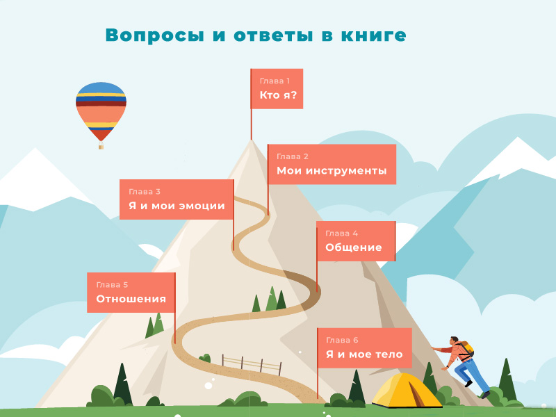 В конце главы составители навигатора подкидывают читателю еще более сложные вопросы и список книг для углубления в тему. Это уже, конечно, уровень ребят постарше, 12‒15 лет. А с младшими можно просто поиграть в процессе чтения вслух в самоисследование и постановку задач для достижения, в «Книгу про меня». В юности, в прекрасные девяностые годы, когда свобода в образовании ограничивалась только здравым смыслом и количеством наличных денег, а не бесконечными циркулярами, я работала несколько лет в самой первой московской начальной Монтессори-школе, и мы с коллегами сами сочиняли такую «Книгу про меня» для девятилеток. Она пользовалась невероятной популярностью. Это была книга-тетрадь, вроде анкеты, и дети усердно заполняли лист за листом. А теперь можно не размножать все это на ксероксе кустарным образом, а просто открыть яркую книжку, исполненную на качественном полиграфическом уровне.