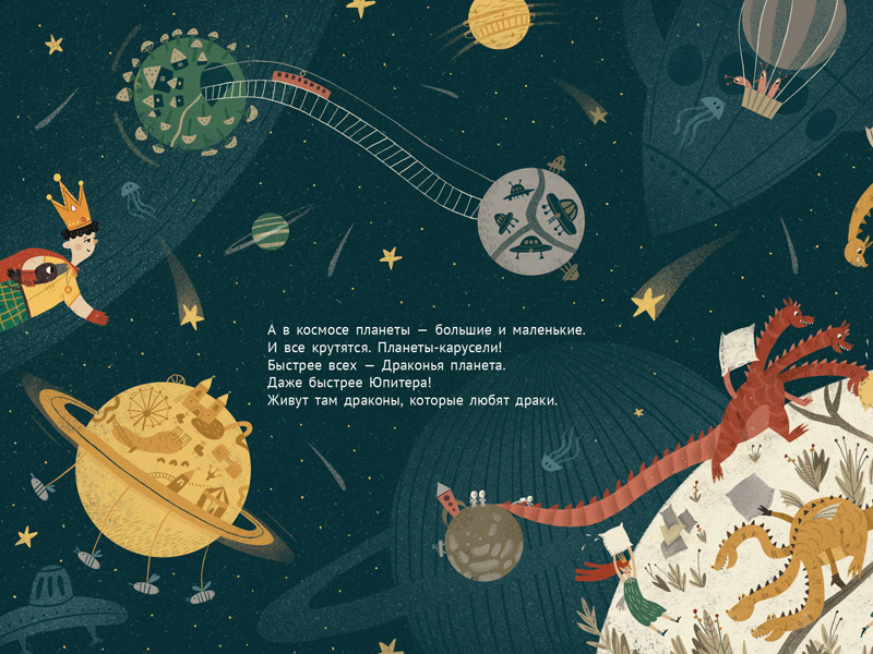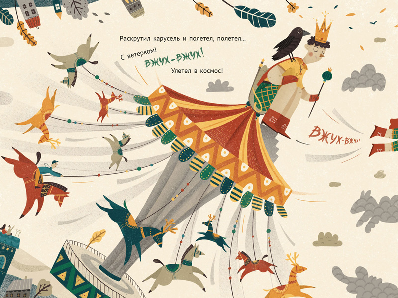 А вот другие герои с крыльями ‒маленькими, почти невесомыми, сказочно-легкими. И сюжет, и иллюстрации, и слова, и песенки пронизаны движением. Вжух! Ах! Пух! Пух! Кар! Ого-го! И-го-го! А-а-а-а! Ух! Все вовлечено в вихрь карусели и сказки: крылья, движущиеся планеты, фигурки…