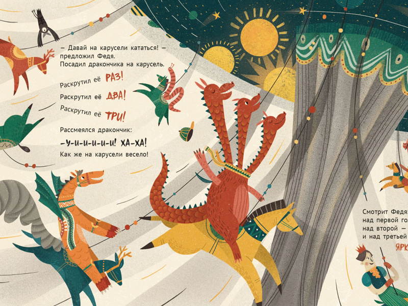 По сюжету Король раскручивает карусель и улетает в космос, попадая на драконью планету. Драконам полагается быть с крыльями, поэтому нашему огромному красному Дракону мы приделываем маленькие сиреневые крылышки. Этот контраст большого тела и маленьких крылышек придает Дракону трогательности. У него добрые и любопытные глаза, маленькие лапки и милые ушки, а чешуйки на спине совсем не похожи на панцирь, они больше напоминают сказочные узоры, и шипы на хвосте и шеях скорее для красоты, а не для устрашения. Он не извергает огонь, и вообще: