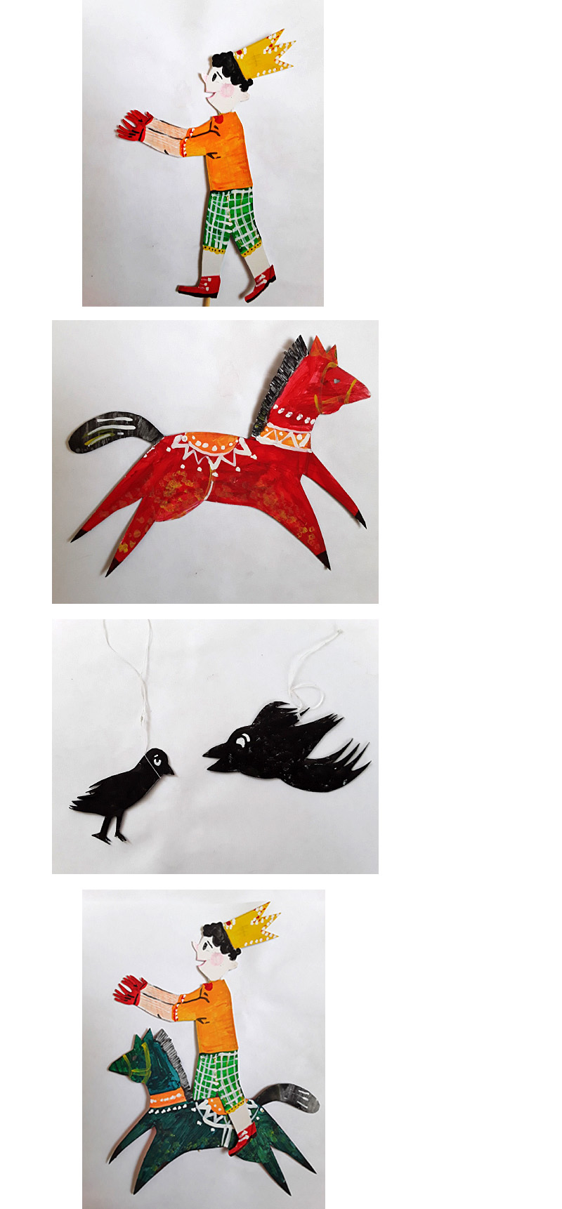 Главный герой – Король (правда, когда-то он был обычным мальчиком Федей) – в зеленых коротеньких штанишках и золотом камзоле. На плече у него Ворона, она будет летать‒ приклеиваем к ней ниточку.