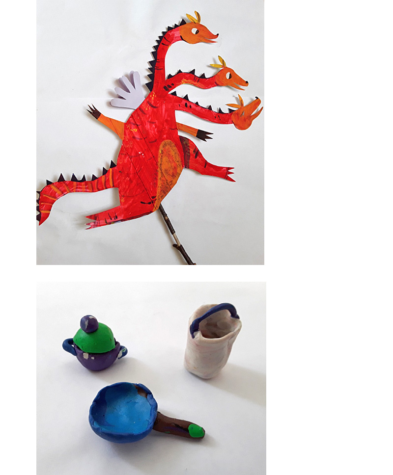 Но для сказки кастрюлю, сковородку и ведро он лепит из пластилина, чтобы одеть их Дракону на голову во время действия.