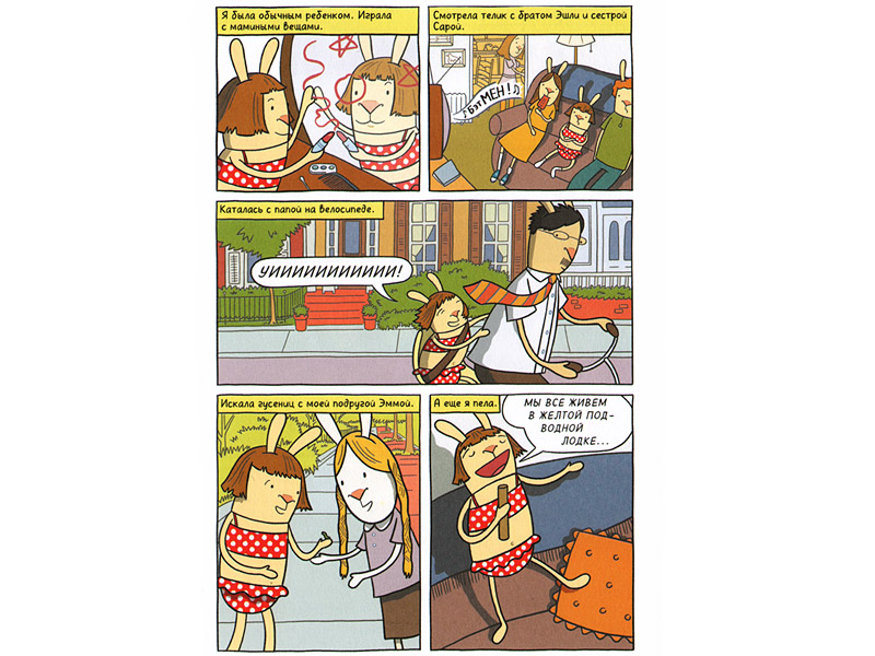 Вся эта животрепещущая узнаваемая реальность показана и с помощью слов, и с помощью рисунков. Я читала комикс вслух и не испытывала никакого дискомфорта: текст тут ‒ совершенно полноценная повествовательная история: