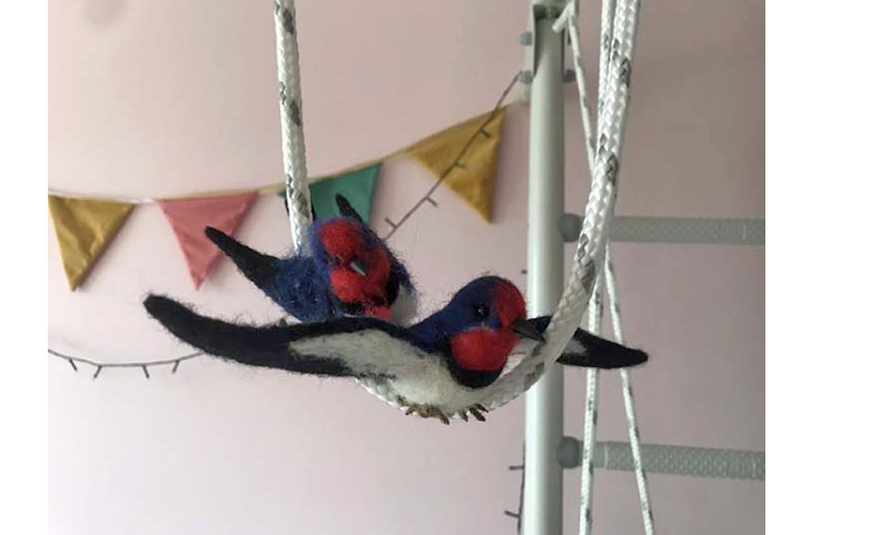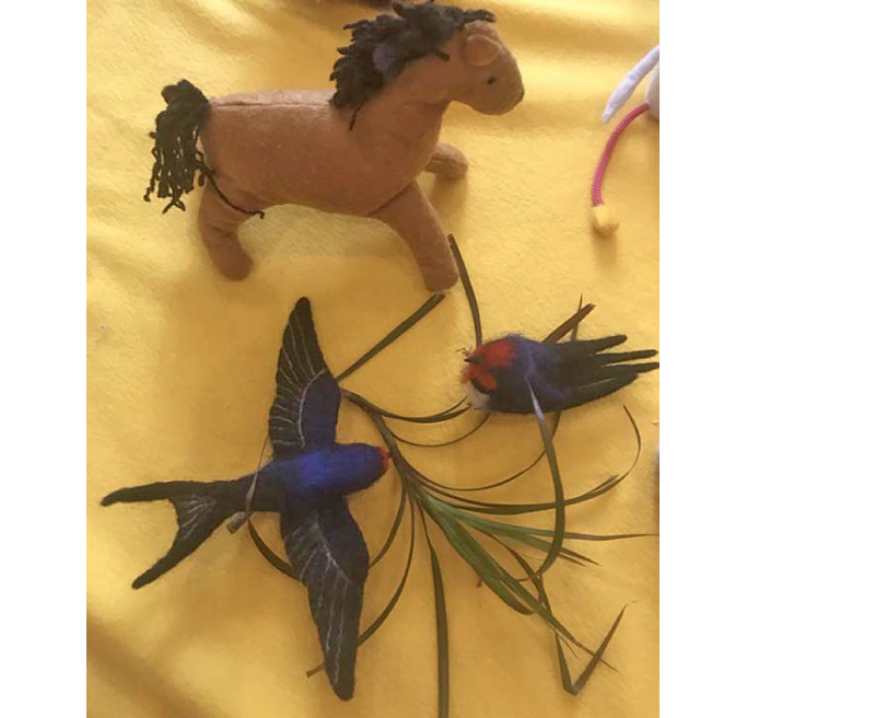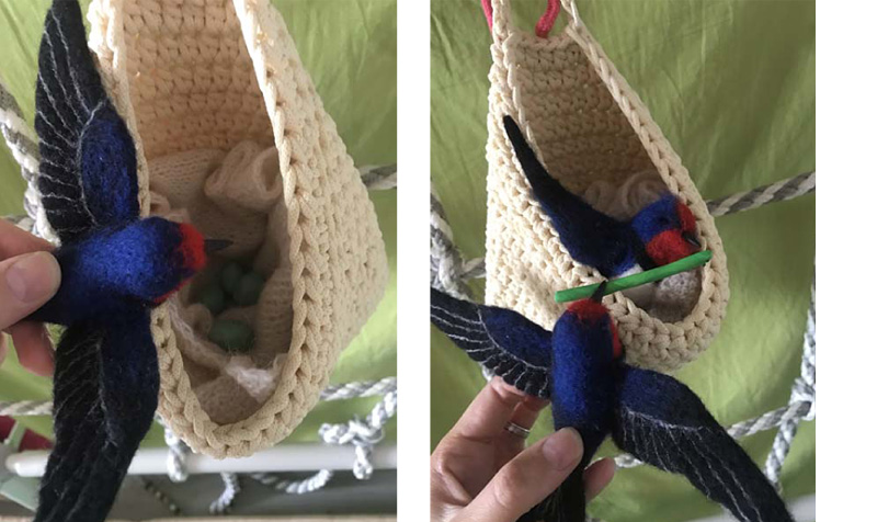 Для этой игры я попросила знакомую, которая валяет игрушки из шерсти, сделать для нас фигурки двух крупных ласточек и трех птенцов, с чем она замечательно справилась. Яйца и насекомых мы слепили сами из пластилина, а гнездо соорудили из подвесной корзинки и тканей.