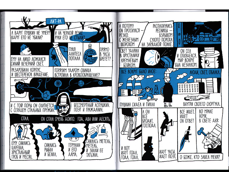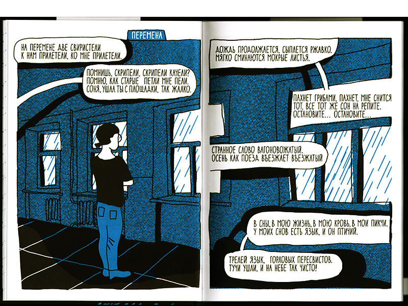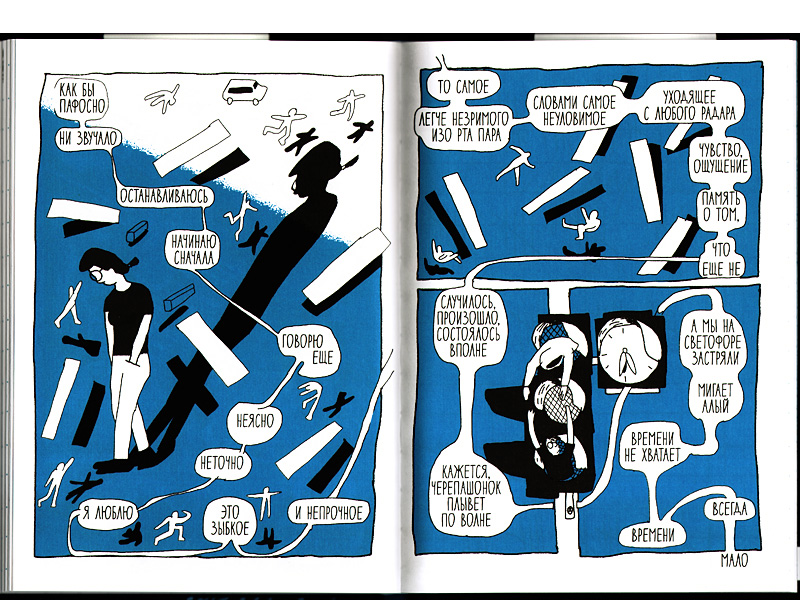 Во второй части стало больше абстрактных эпизодов без сюжета. Если историю о тикающем Пушкине (там и такое есть) ещё можно пересказать, то любые попытки перековеркать прозой красивое размышление возле пешеходного перехода кажутся мне преступлением. Благодаря подготовке к экзаменам в моей голове заела пластинка «внутреннее состояние лирического героя выражено через… передано… показано с помощью…», но если откинуть эти пустые фразы, я не умею говорить о поэзии. Может, иногда и не надо слов?