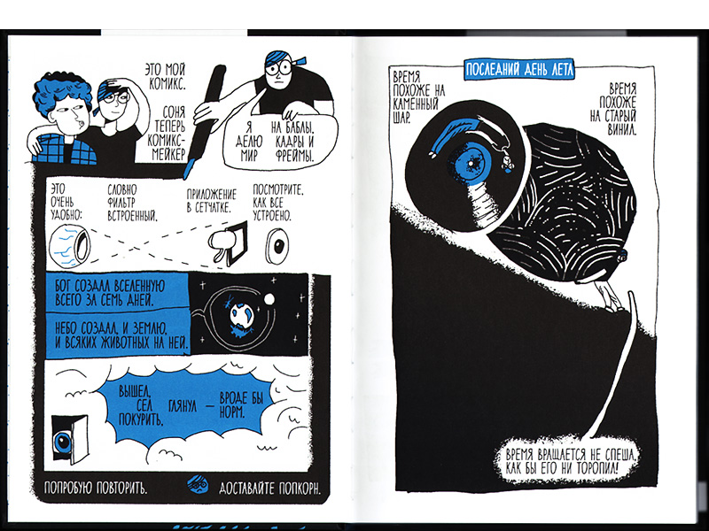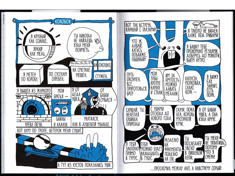 Внутри «Сони-9» есть стилистически разные куски. Например, Глеб пересказывает историю Колобка в форме рэпа. Его даже можно послушать благодаря группе «Fire Granny», на ютубе несложно найти их клип (https://www.youtube.com/watch?v=7bZPYxzBDWo&t=235s). Для меня это такая же магия, как превратить кусок теста в говорящий шар: отрывок из книги смог стать песней, а комикс – анимационным роликом.