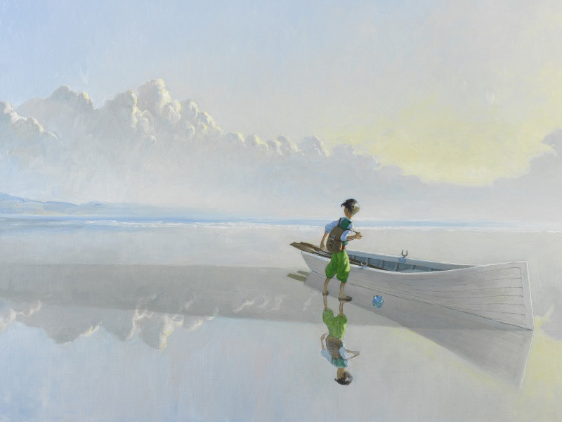 «Жил-был мальчик, которому пришлось покинуть дом и отправиться на поиски нового…» Страшноватое начало. Но картинки на первых страницах – лазурь неба и моря, пышный крем облаков – акварельные, умиротворяющие, не дают испугаться всерьез. У мальчика отличная лодка, он уплывает в неизвестность. При этом в лодке, кроме весел, только бутылка, одеяло и книжка. И еще чашка из дома. А в чашке – горсть земли из родных мест.