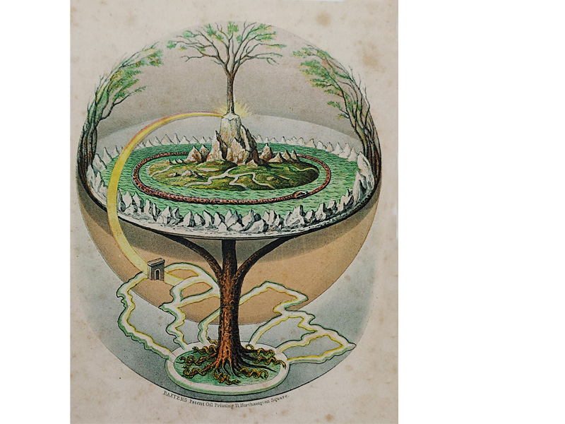 Устройство Вселенной в скандинавских мифах представлялось так: это мировое дерево (огромный ясень) с платформой посредине – это земной поверхностью. Вокруг находится девять миров, рядом с каждым из них ‒ колодец. Колодцы искусственные, рукотворные: каждый из них имеет определенный символический смысл. Миры взаимосвязаны, и особую роль здесь играет мост Биврест. Он ведет, например, в Миргард. Это название кажется смутно знакомым, так же как и Мюрквид. Здесь параллельно возникает другая тема: Толкин и его миры. Об этом тоже рассказывается в книге: отдельные названия, сюжетные истории пришли в книги Толкина из скандинавской мифологии, которую он изучал как профессиональный лингвист и филолог. Например, знаменитая игра в загадки в «Хоббите»: оказывается, подобное состязание описано в скандинавских мифах об Одине. Знаменитый Гэндальф – это, по сути, Один. На первый взгляд, это сравнение кажется странным, но потом выясняется, что их объединяет общий псевдоним «седобородый», а также тяга к странствиям и некоторая двойственность: и Один, и Гэндальф – фигуры таинственные, не всегда понятные и обнадеживающие для окружающих.