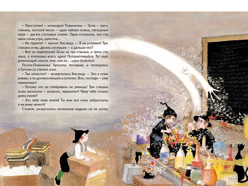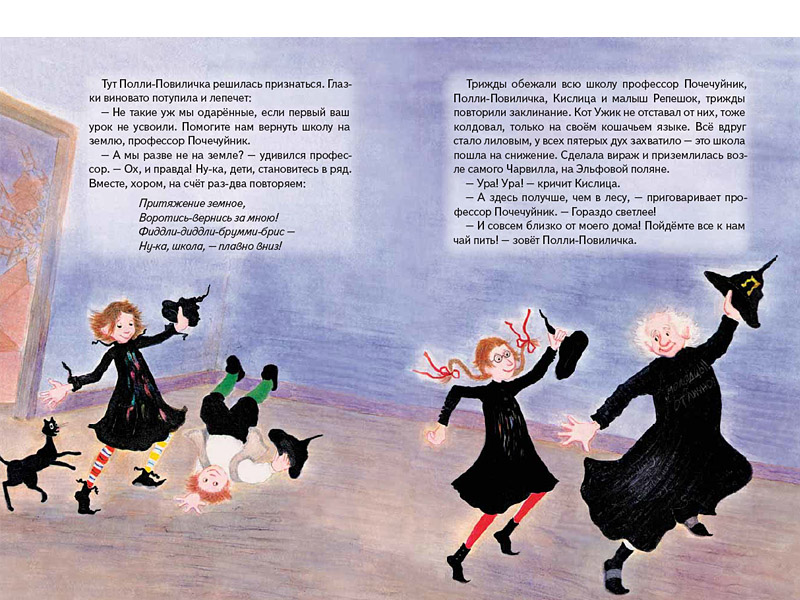 Но вернемся к книге. Ведь осталась еще третья сказка – про Полли и зачарованную школу. После нее развернулось сразу три игры. Во-первых, снова в школу, но уже иначе: Саша уселась за стол и стала переписывать слова из книжки. Во-вторых, в приведение. Саша завернулась в простыню и стала пугать всех вокруг страшным криком «Зюуууу!». И в третьих, в летающую школу. Саша громко декламировала заклинание из книжки: